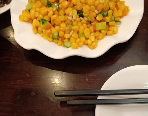 除了炒肝还有家常菜卖,价格也不是很贵。松仁玉米22元一份,挺清淡的。羊肉串10元一串,两串起卖,有点像稻香村的油炸羊肉串。