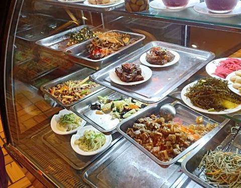 除了炒肝还有家常菜卖,价格也不是很贵。羊肉串10元一串,两串起卖,有点像稻香村的油炸羊肉串