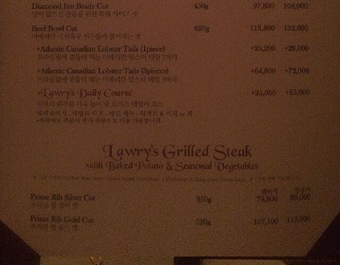 Lawry’s The Prime Rib是1938年始于美国贝弗利希尔斯,至今已经有78年的历史了。在全世界只有包括首尔在内十个城市有分店,采用特殊香料及岩盐熏烤的牛排是Lawry’s The Prime Rib的特色料理。距离江南站非常近,是江南区最有名的高档西餐厅。