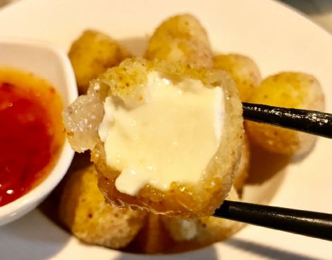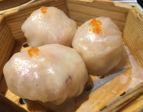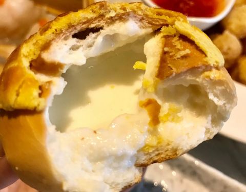 「水牛奶菠萝包」 让我们来揭开水牛奶菠萝包的庐山真面目~酥皮菠萝包灌入牛奶。牛奶不是很冰就别期待冰火两重天了。一咬开就流出来了也不要期待好看的吃相。包就是普普通通的小餐包。给了它两次机会可还是就这样吧,不喜欢包体。下次不会再点了。 「芝士糯米鸡」 喜欢这个!芝士和糯米的组合!又有鸡肉又有香菇烧卖的既视感和口感。顶胃。 「大虾饺」 真的大 很完整。虾肉和笋丁混合的饱满的馅料偏干一些。但还是满足的。 「一口酥豆腐」 好好吃哦。酥皮炸得有点像炸鸡。里面的豆腐好水嫩嫩。趁热吃有爆浆的感觉。一口一个蘸酱好好味。
