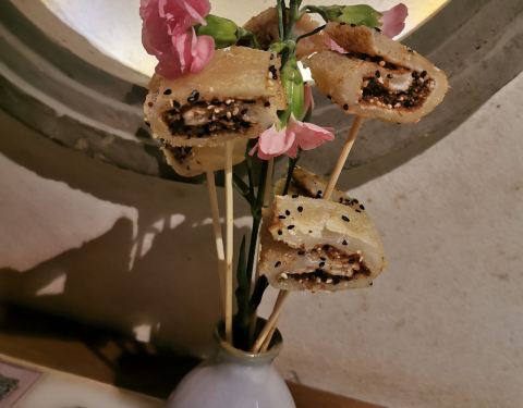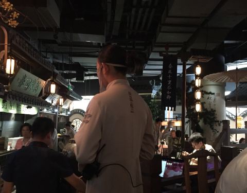 杭帮菜餐厅的装潢走古风,服务小哥穿的长衫也很飘逸。菜肴精致可口,摆盘漂亮。叫花鸡上来一个蓝子,让食客敲三下取吉祥许愿之意。
