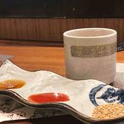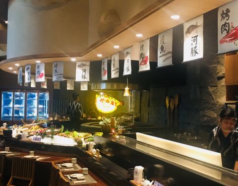 三个火的YAN,和松月,悦满庭是一家,在富力中心二层,有停车位免停二小时,服务生全部都是和服装扮,入口脱鞋后可以选择光脚也可以穿袜套,袜套一次性比较服贴,黑色,通道地道全是一溜竹席,拾阶而上,操作眏入眼帘,一只大大的河豚打着光笑眯眯迎接你,可选堂食也有包厢,包厢雅座脚的位置是可以放的舒服的,不用屈在那弯在那,装饰简洁清新,话说生鱼片超级厚啊!两个人点一份即可,二份就多了,牛舌手艺不错,土瓶蒸中规中矩,还可以再去,有河豚三吃法,没吃过!有时间试试!