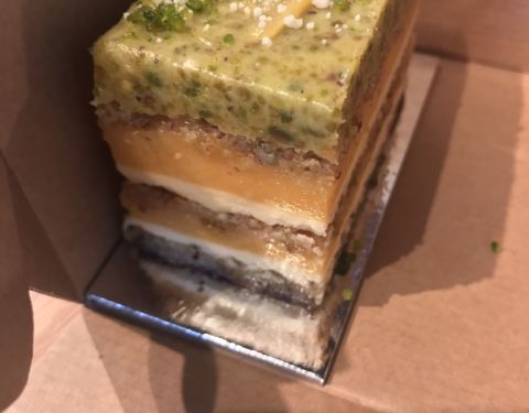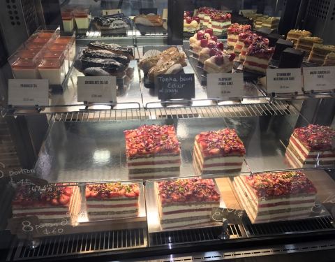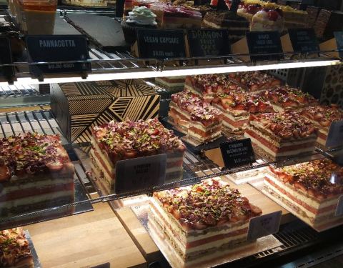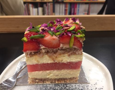 拔草悉尼网红西瓜蛋糕!cbd店离住的酒店很近,就是一不小心又被澳洲的楼层给坑了,说是二楼,其实是国内的三楼。在一家书店旁边,坐扶梯一上来看到一大堆妹子排队的地方就是这家店啦。蛋糕价格很亲民,有各种尺寸可以选择,我们点了一小块西瓜蛋糕,一小块柠檬开心果蛋糕。结账的时候,帅小哥可怜巴巴地说店里全都坐满了,问我们愿不愿意打包,伸头一看确实完全没空位了。西瓜蛋糕真的名不虚传,和澳洲一贯的甜点口味完全不一样,一点不甜腻,西瓜和上面的果酱搭配起来,中和了蛋糕的甜腻,口感很清爽,甜度适中,根本停不下来!!开心果蛋糕就和当地惯常的甜点口味一样,有些太甜了。无论怎样,西瓜蛋糕绝对值得品尝