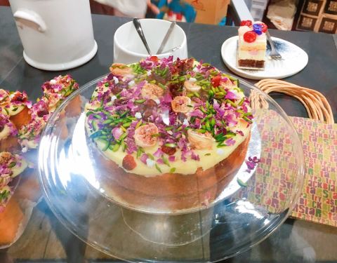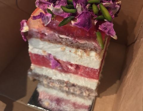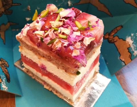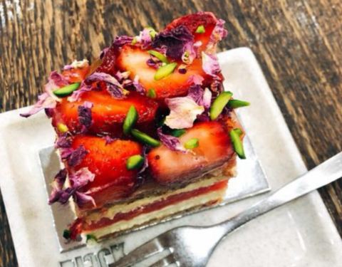 这家店最出名的是草莓西瓜蛋糕,它不是简单的西瓜口味的蛋糕,最上层是新鲜的草莓镶嵌在酸甜的草莓玫瑰啫喱里,铺陈大量干玫瑰花瓣,每一口都吃得到喷香的玫瑰味道,同时撒有充满春天气息的嫩绿色开心果仁碎,不同于一般的奶油蛋糕采用海绵蛋糕做夹层,西瓜蛋糕的夹层是法式杏仁蛋白饼,一层法式杏仁蛋白饼一层鲜奶油一层冰爽西瓜,这是一块口感极为细腻的蛋糕,颜值味道都在线
