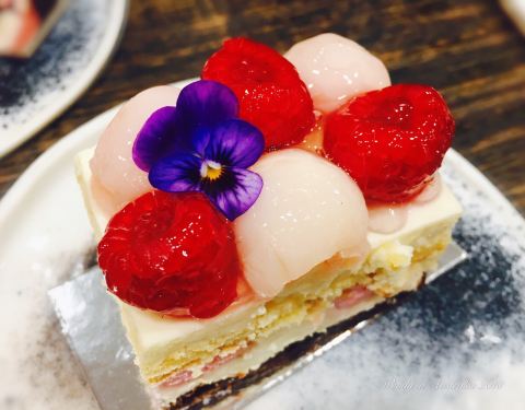 荔枝蛋糕,上面铺着荔枝和莓果,咬起来有股玫瑰的花香,口感没有鲜花饼甜,味道比西瓜的差一点