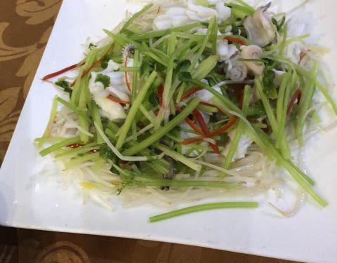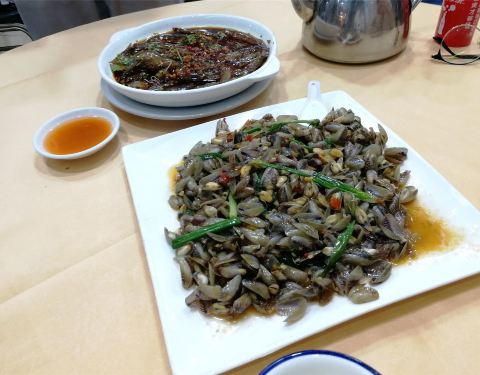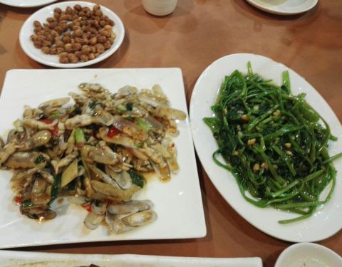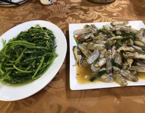 本来要找其它店,偶然看到这一家。见到那么多鲜活的海鲜就进来了。蛏子,海瓜子非常新鲜肥美,也非常入味;普宁豆酱炒的空心菜中规中矩,牛肉炒粿条镬气十足,芹菜炒鱿鱼火候稍稍过了一点点。再加上一大盆丝滑粘稠的白粥搭橄榄菜,吃得舒服满足