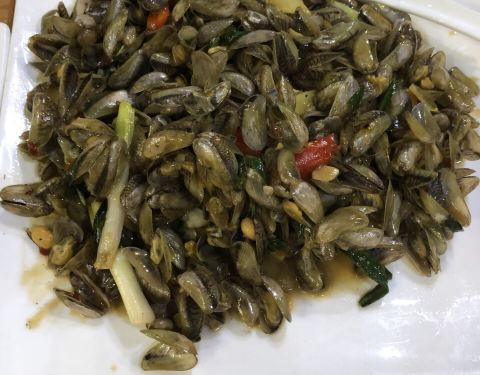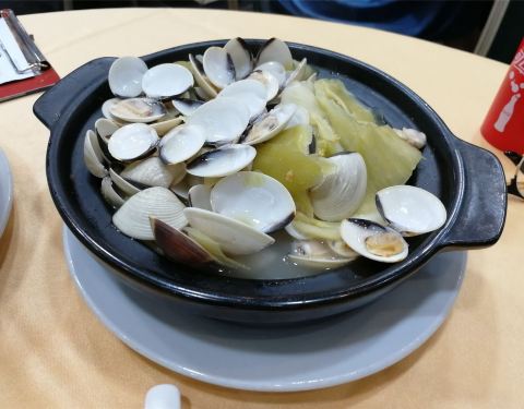 蛏子,海瓜子非常新鲜肥美,也非常入味;再加上一大盆丝滑粘稠的白粥搭橄榄菜,吃得舒服满足
