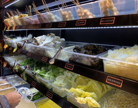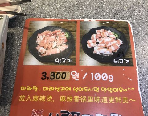 店面干净,整洁。 食品自助挑选区, 有不同种类的鱼丸,菜类,菇类, 还有虾,小章鱼,豆卜等等, 大概20多款材料任选。 麻辣烫有原味,小辣,中辣,大辣选择。 对于不爱辣的人,小辣就刚好。 和麻辣烫最配搭的就是鸡蛋手抓饼和锅包肉。 我当然也是不能错过, 回锅肉有点像韩式糖醋肉, 但我个人觉得锅包肉好吃多了。 鸡蛋手抓饼也好吃,个人觉得但比不上国内。 想念国内的味道, 就会来明洞鑫龙福麻辣烫✌️