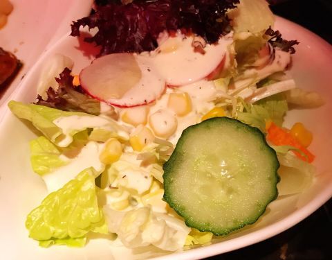 肉祖宗们,不要放过这家餐厅,简直是肉天肉地,荤香满溢!菜品实在太多了,量又是辣么多,大胃王终于不用在自己还是同桌能吃饱之间纠结了。 主菜推荐: 火焰猪肘,猪肋排,香肠拼盘和牛脸颊,四选一就足以满足肉食动物的一餐需求。尤其是猪肘为德式餐厅的特色,而且此菜在火焰点燃前请务必准备好相机、手机。猪肋排的酱汁浓甜,颇有上海本帮菜的风格。牛脸颊肉酥软入味,可以沾面包,私下觉得拌米饭是不是也会很好吃。香肠拼盘里有四五种香肠,印象最深的是有一种带芝心的特好吃。什么,有人担心肉肉的脂肪过高?那还有三文鱼和鳕鱼伺候,个人偏爱有肉质感的熟三文鱼,不过煎鳕鱼可能更适合口味清淡的朋友。 餐前的蘑菇汤和烤面包也让我欲罢不能,虽然同桌不断提醒我留点空间给后面,特爱细碎的蘑菇粒与奶油汤的融合口感。 沙拉推荐: 鳕蟹沙拉和冷切牛外脊,两者都挺开胃的,鳕蟹沙拉更是鲜甜爽口。 餐厅的装修别致,进门后最吸睛的莫过于头顶倒挂的轿车,还在慢慢旋转着呢,卫生间也值得参观打卡一下哟,其它细节就等你观察发现了。晚上八点半后,这里转变为酒吧风格,驻唱歌手将上场,气氛会被带入一波新高。