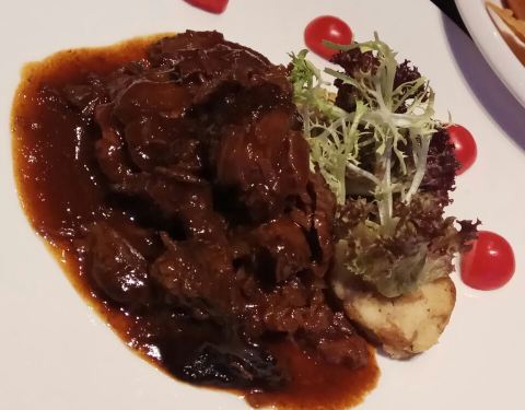 第一口很好吃,稍微有一点点肥,旁边有酸菜解腻,土豆泥很好吃~ 奶酪德式意面,另外加的,面硬且无...