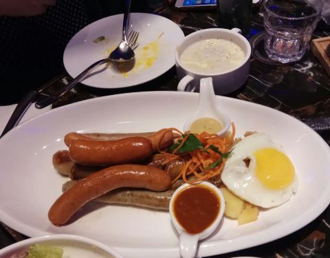 - 香肠拼盘里有四五种香肠,印象最深的是有一种带芝心的特好吃。什么,有人担心肉肉的脂肪过高