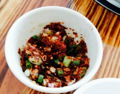 ...片完鱼片后留下的鱼骨架用来熬在汤汤里提鲜,一鱼三吃,红汤一边,也辣得确实够劲,适合爱吃辣的朋友