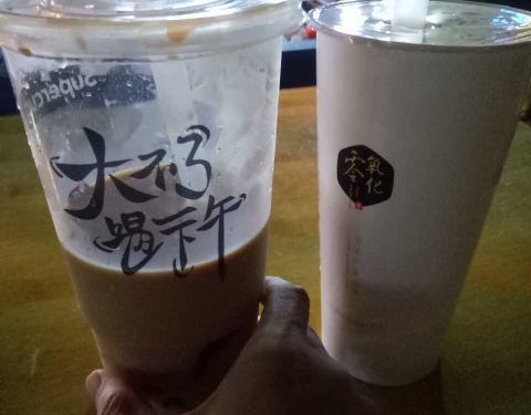 我要的是大杯的“香芋糯米奶茶”温的,儿子要的是特大杯的“什么都有”!第一口喝起来太甜,可能是口渴的缘故,很不舒服,很想喝水,结果他家的杯子都是点过数的,不能随便用,就没要,再喝下去又不太甜了,很舒服,又解渴有解饿,一杯下去,晚饭也省了!