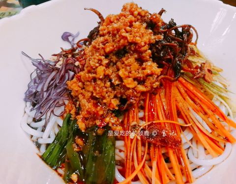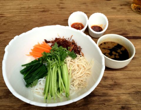- 鸡丝凉面 没想过面居然是有嚼劲的米线,上面的鸡丝是炸过的,脆脆的,加一点辣酱,拌匀了吃也太美...