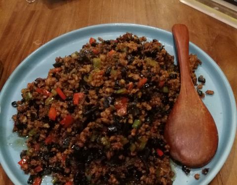 - 狼牙土豆有点瘫软了,笋是原汁原味的,乌鸡丝肉质紧实很好吃,烤五花肉也是脆脆的很有嚼劲