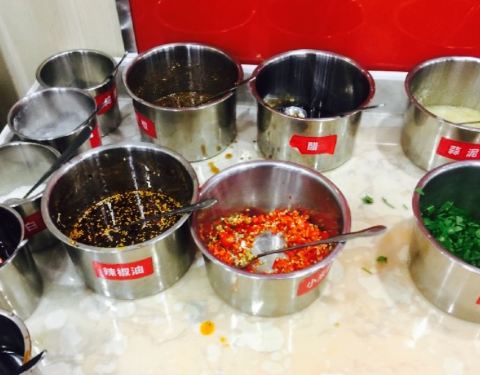 两个人一起点了一份大份的,之所以我调了两种口味,是因为彼此的口味不同。这家店我是第一次吃,也算是慕名而来。这里荤素是一个价格,直接一起称的。多称荤的,比较合算。调味料很可口,可是我觉得原汤有点咸,加入了调味料就更咸了。种类不算太多,要是能更多点的选择就更好了。