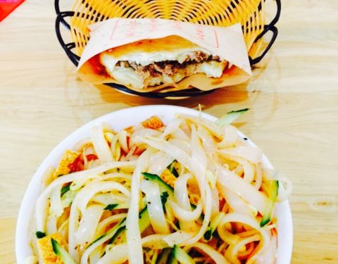 酷爱西安美食的我,无意间发现单位边上开了家陕西面馆,兴奋之余,立马付诸于行动,点了一份最爱的凉皮和肉夹馍,凉皮8元其实整体味道不错,酱汁调的够味,不过凉皮还不够筋道,肉夹馍里面的肉超美味的,就是馍稍微有点过于软,没有酥脆的样子,希望能改善,下次去尝下哨子面和三合一。
