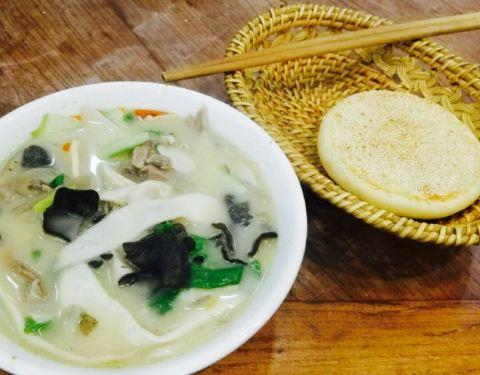 这家店也是西郊比较有名气的店之一,在棉纺路上,地段不是很好,不过人好多。我们中午去的,门口的汽车,自行车都停满了。屋里已经没有位置了,大家都坐在外面吃。羊肉汤味道很清淡,没有想象中的膻味,汤里有木耳,杏鲍茹,扁粉条等。羊肉炖得很烂,入口即化,不塞牙。汤喝完也没有糊嘴的样子。烧饼也很有特点,比一般的饼要厚些,外面有一层芝麻,里边是软绵绵的面心。泡在汤里或是就着吃都很可口。