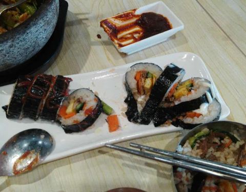 味道一般吧,吃饭过程很让人郁闷,两次把我的餐往别人桌上送,拌饭还是从别人桌上端过来的。再说寿司卷,包的不紧,一夹就散,外面的紫菜都没切开,夹起一个其他的也全弄散了,真是够了,不会再去第二次