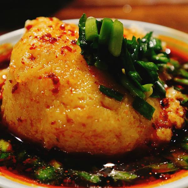 一股发酵的味道,偏酸,建议向店家多要一点韭菜,韭菜腌过,很咸可以压制发酵的酸味,可以体验,毕竟特色。#洋芋搅团 8元一份