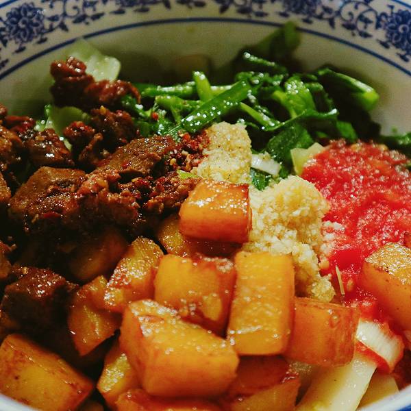 再次来到榆中县这家玉泉山庄,烤全羊,外皮酥脆,就着大蒜和香辣面儿口味各不一样,据说这个山庄擅长的就应该是烤全羊。糖蒜解腻,其他小菜都是陪衬,面食我是看到不敢吃了,太容易撑着,烤洋芋还是忍不住啃了一个。这个山庄有点复古味道,加上兰州蓝天白云和晚霞辉映,是休闲的好地方。
