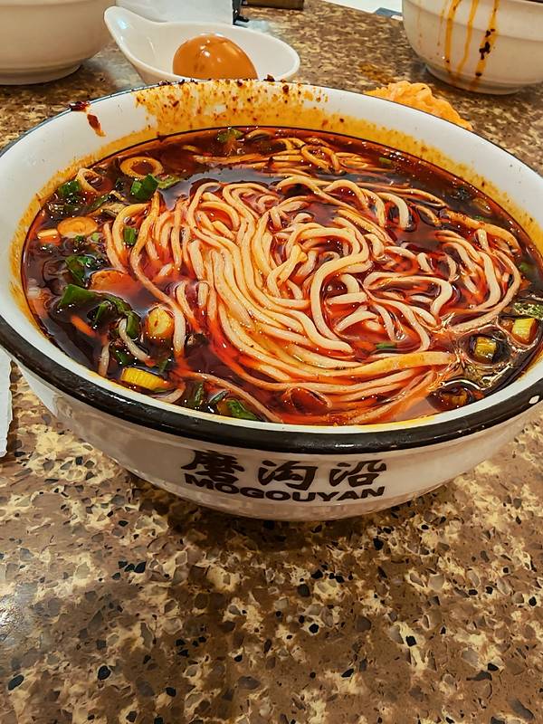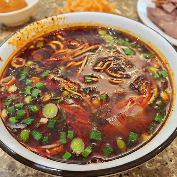 这家店门头气派,里面空间更大,座位全满,只能趁人起身眼急手快抢座。出面窗口排着老长的队伍。木椅,人造石桌面。肉片是单独用盘子装出来的,成都做兰州牛肉面的师傅,刀工好极了,牛肉切得薄可见光,这边的又厚又大三细,口感不错,牛肉也香,怪不得人这么多。
