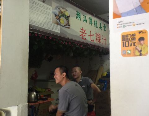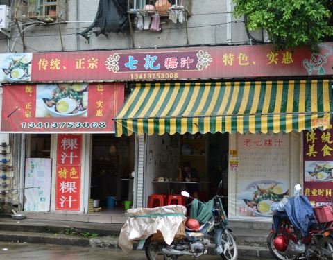 上一次来潮州,听客栈老板说起粿汁,先以为是果汁,后又臆测为糊状汤汁。这次来,找机会更正了一下错误信息。 找到攻略里推荐的开元老七粿汁,老房子里很旧的店铺,因为是早上刚营业,客人还不多。 点了小份的,料足好吃。