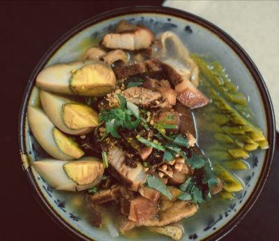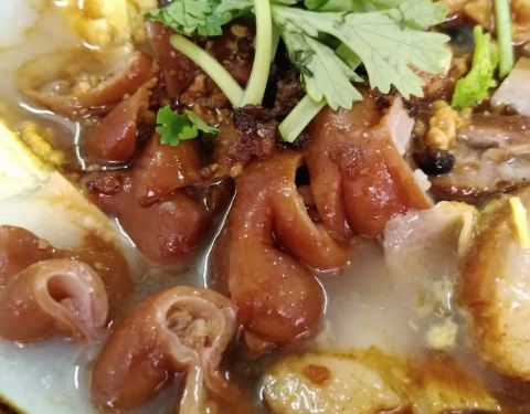 ...宽米粉,更筋道,浇头是各种卤味,卤蛋,卤肉,卤大肠,卤得很入味,从来不吃大肠的人表示大肠有点少