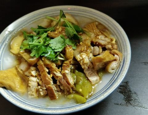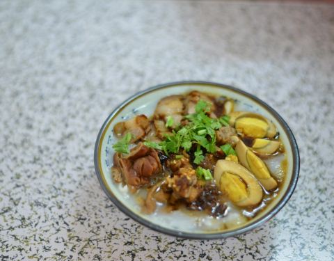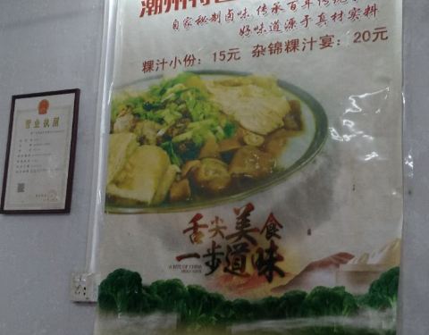 非常推荐的潮洲早餐之一,靠近开元寺,要从一个路口拐进去,远远能看到的标志很小,要跟着定位走慢点好找到。 潮州的早餐多种多样,都是小摊小店,这家也不例外。比较破旧的店,左边是厨房,右边是用餐区,简简单单摆几张桌子。潮州人都挺友好,问老板何为粿汁,老板告诉我粿汁是把米浆用火烤然后在晒干保存,要吃的时候再下锅煮,配上青菜和卤味等,有点儿像福建的锅边。 这家只卖粿汁,小碗15,大碗杂锦20。小碗已经很大了,端上来已经满满一碗,上面铺着卤的豆干,大肠,卤蛋等五六样,每样三个以上,非常实在。粿的口感软糯,汤会渐渐稠起来,卤味的味道很赞,很入味,特别是薄片豆干和卤蛋,一楼惊艳好像再吃一口。 还有一点碗筷都不是一次性的,一种真实的本地人生活的感觉。