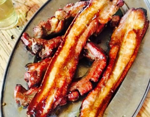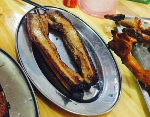 烧鸡,烧排骨都是我最爱吃的,听说在万达广场隔壁有一个小店就是以这些烧烤出名的。烧鸡,烧排骨我就吃得多,该店居然还有烧叉烧。烧叉烧居然连猪皮一起烧,韧韧的,入口甘香,简直无法用言语来表达它的美食。店家环境是大排档模式,简简单单,但是没有关系,美味可口的东西,通常注重的是食品而不是环境。美食攻略,哪的烧烤可以提前用电话预定的。