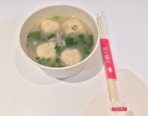 小杨生煎( 常州月星环球港),晚上江南环球港散步一圈下来,肚子咕咕叫,一看小杨生煎,全国连锁,中粮食材!果断点了鲜肉、大虾生煎,共4只。鱼丸汤,一碗。店面小而精,没洗碗的地方,无奈之下,只能采用一次性环保餐具!