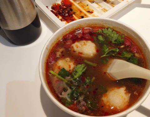 - 个人认为肉的比虾的好吃。总得来说,好吃。店面不大,人很多,要排队。鱼丸汤有点咸,鱼丸劲道足