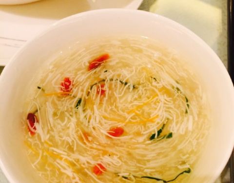 在香格里拉的中餐厅,上菜比较慢,可是做得比较精细,豆腐羹很好喝,豆腐切得细如丝,鳕鱼稍微有些腻,烧饼配咸菜还是很不错的。餐厅里有人吸烟,味道特别难闻,也没有人管,这点特别糟糕,星级酒店是禁烟的,四处都是标识,却没有执行。