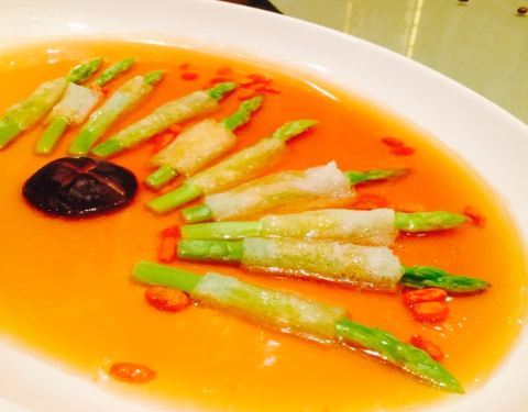 第一印象,香格里拉的牌子还是有品质保证的。包厢里挂了幅油画,风格却是国画写意的,我不懂艺术,不过也觉得安徽餐饮服务业在徽派文化的推广上有很大贡献。或许这就是文化底韵的原因吧,许多小店的装潢都很有味儿。还有个细节,每个客人的两个盘子都是精心摆放的,细看是幅画。以两个盘子为画布,对齐了才能看出去,很用心。有图有真相的。味道还好,重点是不太咸,合适我的口味。位菜是辽参,这是我在合肥遇到的比较好的了,基本上对得起这个价钱,口感不错。豆腐忘记是什么名字了,配了虾皮,葱花和肉酱,嫩滑咸香,十分喜好。鱼什么的就不多说了,攻略口味。主要推荐一道主食,抄手。就是它了。下单之后等了好一会儿,服务员解释说他们这的馄饨是现包的,所以要久一点。果然,端上桌子,一尝之后,值得强烈推荐。皮儿薄,馅儿足,味道好。另外再提一句,他家的服务确定好,每个服务员都挂着笑容,只要对上眼睛,马上问好,即便是隔着门缝。竹荪芦笋,比较清淡。