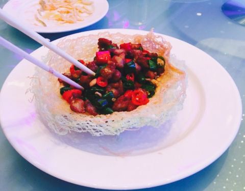 在香格里拉大酒店吃的喜宴,格调很高,菜也很美味。唯一一点就是菜的分量太少啦,盘子倒很大。真是传说中高***,但对婚宴来说,有点不尽兴。主要推荐香菇包,第一次吃,没想到是肉馅的,还挺好吃。基围虾两种吃法,无论哪种都很清新。
