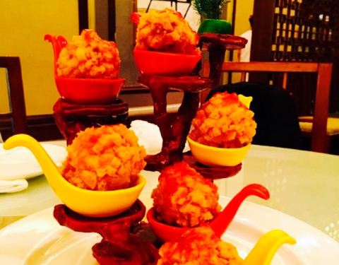 位置在一环上,什么点都很堵。调头绕进去搞了20分钟。酒店环境没的说,服务也很棒,定的时候没有注意到,不给带宠物,亲戚就只好把狗狗送回家了,幸好离得近啦。但是可以理解这个规定。挑了几个菜照相。灌汤虾球每桌必点,很实在,比照片上大,我吃完一个以后居然直接就饱了。烤鸭中规中矩,但的确比合肥的全聚德好。赛螃蟹入口顺滑,虾仁很大。鱼头汤非常鲜,老小都爱喝。竹笙裹竹笋,也很棒,不过份量不大。适合商务宴请和正式家宴。