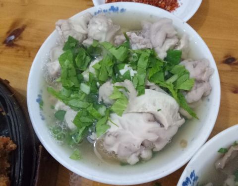在网友攻略上看到这家店人气和评论都很高,到峨眉山玩的途中,专门绕到这来试了一下,跟着百度地图导航很容易就找到了,在一个小巷子里面,门口就可以停车。这家的跷脚牛肉跟平常吃的不太一样,这家的跷脚牛肉不用点火自己煮,而是煮好了直接端上来就吃,可以分开点一份一份的,也可以点混合的一盆一盆的,我们5个人点了一个50的大盆,一份粉蒸牛肉,一份粉蒸肥肠,一份血,一份爆炒脆肠。跷脚牛肉味道很浓,没有牛肉牛杂的膻味,汤很好喝,只是喝了后会感觉嘴巴附了一层牛油,但是正好也说明人家是资格的牛肉牛杂熬的汤。粉蒸牛肉和肥肠很不错,10多块钱那么大一笼,成都是绝对吃不到的,味道也很正宗,辣辣的很香。脆肠真的好脆,血也好嫩,味道都好好。一顿饭吃下来才100出头,人均20,确实超级划算,典型的可口不贵。