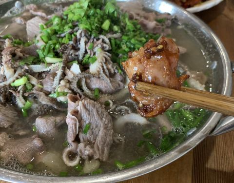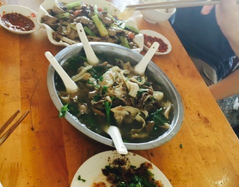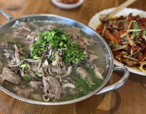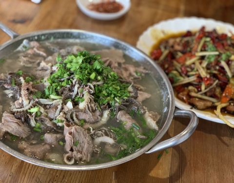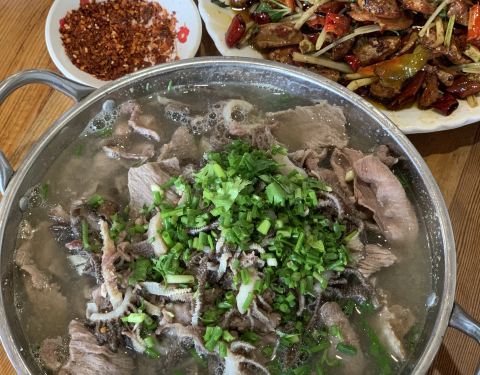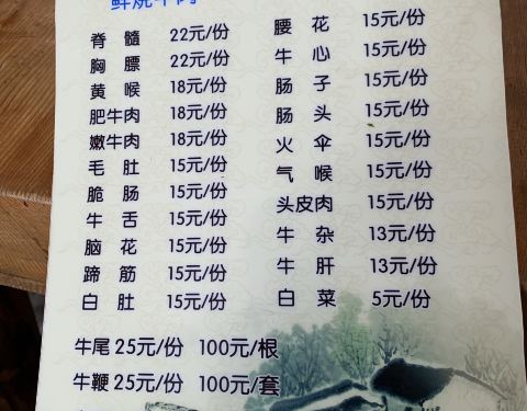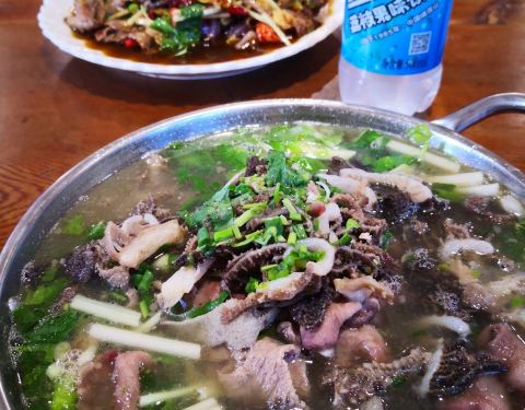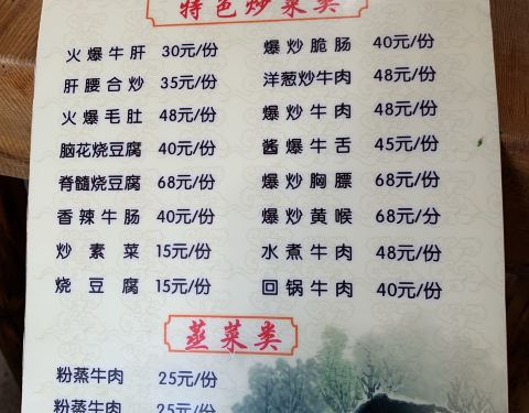 1,蒸牛肉,蒸肥肠,20,肉很大一块,味道还不错。肥肠洗的很整洁,本人喜欢肥肠,牛肉偏干。2,跷脚牛肉汤锅,忘了加素菜,里面牛肚牛脊髓都还挺多,汤很好喝,沾点辣椒面吃简直是美食,必须推荐。3,炒牛肚,可口,特别脆,一点腥味都没有。4,炒牛肠,味道和牛肚差不多,口感不同罢了,还是美味。