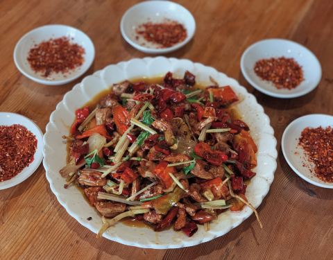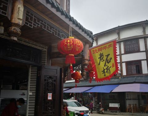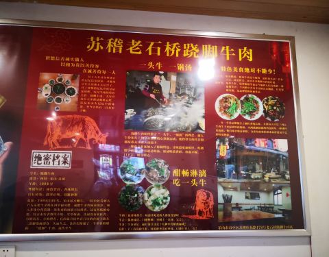 苏稽镇是跷脚牛肉的发源地。吃在四川,好吃在乐山,乐山的跷脚牛肉从当年劳苦攻略的下里巴人的果腹之餐,到现在攻略喜爱的特色美食,成为乐山市非物质文化遗产,走过了近一百年的路。苏稽镇的跷脚牛肉,有特别多的品牌,人人都想做大,高大上有***的有古市香,易老八,周记等等。但最接地气,最美味,最实惠的苍蝇馆子,老石桥跷脚牛肉的确算第一名。它的跷脚牛肉的烫制保留了古法,味道上得到了本地人和外地人的共同认可,价钱很公道,就是吃饭环境一般,苍蝇馆子嘛,就是这样。位置就在苏稽镇老石桥的一端,坐在店里可以看到流入岷江的河水,热热闹闹的时候也是车水马龙。