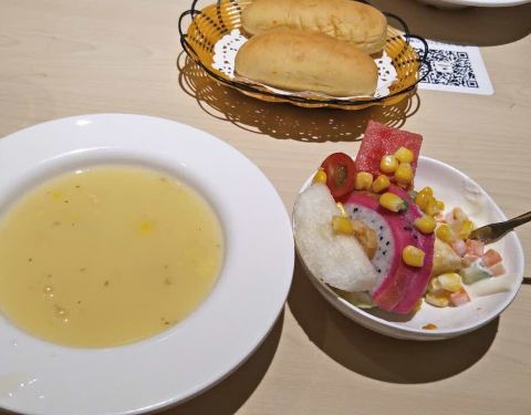 今天带家人来吃,虽然没自助熟食(豪客来专于牛排就好),但水果丰富(为娃娃,另外再点些鸡米花)在()3人牛排套餐+这单点份牛排+鸡块,总的270。还是挺好的。沙拉丰富,吃的饱饱的。快1点的时候,人高峰期过了...