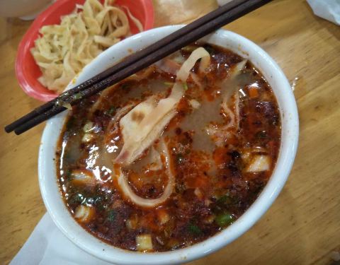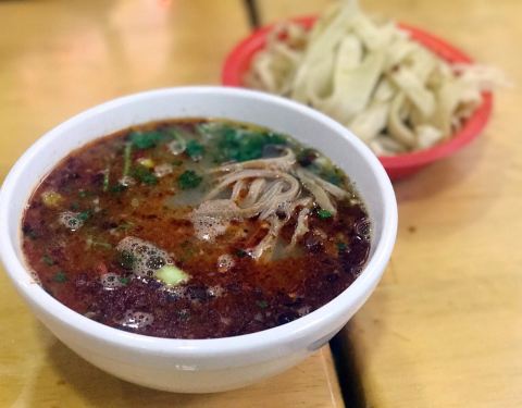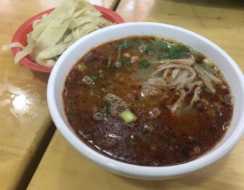 离开洛阳市前,当地朋友建议我一定要试试洛阳的牛肉汤,说是和其他地方的完全不同,我被说动了,冒雨寻找他介绍的牛肉汤店,结果发现就在我昨晚入住酒店相隔100多米的地方。对面正好有个停车场,还挺方便。 下着雨,屋里人员爆满,连外面也搭起了遮雨棚,放了几张桌子供食客解决午餐。我运气不错,进屋时正好有人离开,于是迅速见缝插针用背包占位,然后马上点了牛肉汤和饼丝。 牛肉汤分为好几档,唯一区别就是牛肉的多少,还可以选择牛肉牛杂双拼。要了份10元的双拼,外加一份饼丝,其实就是饼条啦,完全够我饭量的饼丝,居然只要1块钱,不由再次感叹洛阳的物价之低。 和淮南牛肉汤不同,这里的牛肉汤真的里面就全是牛肉(或牛杂),除了葱花、香菜、一点辣油外,没有什么其他的东西,汤味更为厚重、浓香,给的肉是真多。按个人喜好可以继续加醋和辣椒,小料罐子就在桌上放着。 味道好,性价比高,怪不得生意这么好~