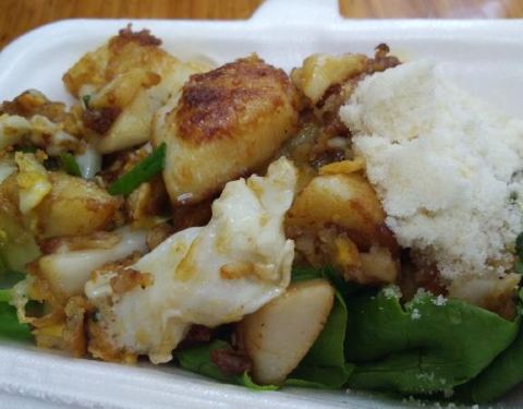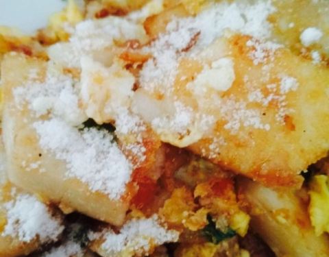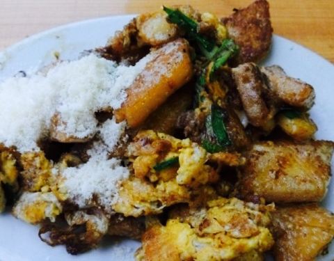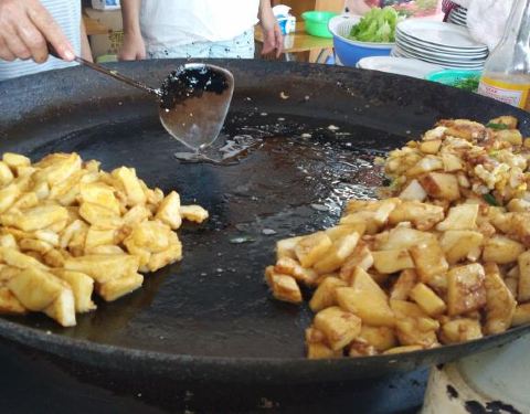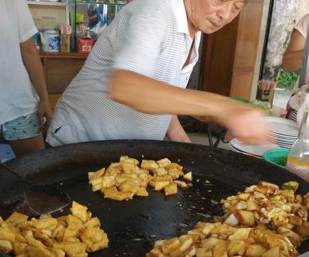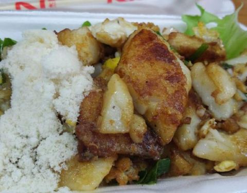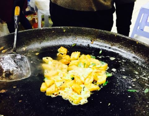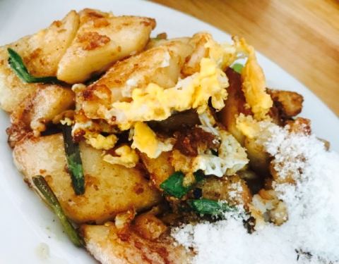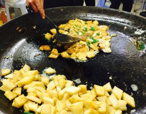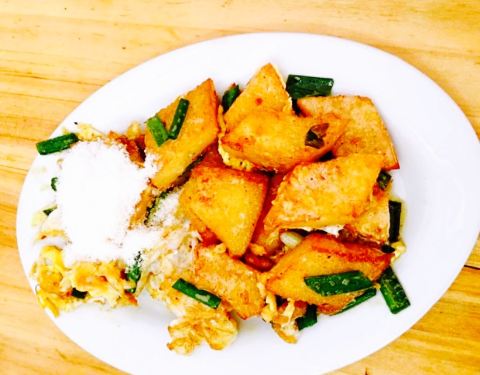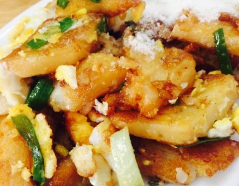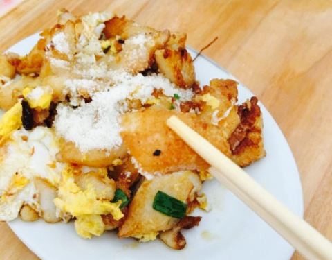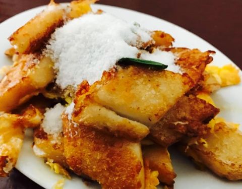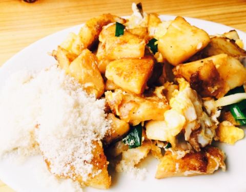 第二天的早上睡到自然醒,原本早餐打算吃飘香小食店,刚好路过老王牌炒糕粿,早上客人不多,老王伯伯正在平底大锅炒着一份份的糕粿,于是决定先在这里买一份炒糕粿。 看网上的介绍一份炒糕粿10元,但估计国庆涨价吧, 一份小的要15元,大的要20元。我们要了一份小的尝尝味道。糕粿还没有炒熟的时候看上去就像白米糕,白白嫩嫩的。老王伯伯把糕粿煎成金黄色,然后再加入鸭蛋一起煎炒,很快一份热腾腾的炒糕粿就起锅了。 端上来的时候还不忘提醒要小心烫,可以蘸旁边的白糖粉一起吃风味更佳。我们迫不及待的咬上一口,软软糯糯的,口感很像萝卜糕,但没有萝卜的味道。个人不太喜欢蘸白糖粉吃,糕粿本身有一点点的咸味,原味吃感觉更好,朋友更喜欢的是蘸辣椒酱。