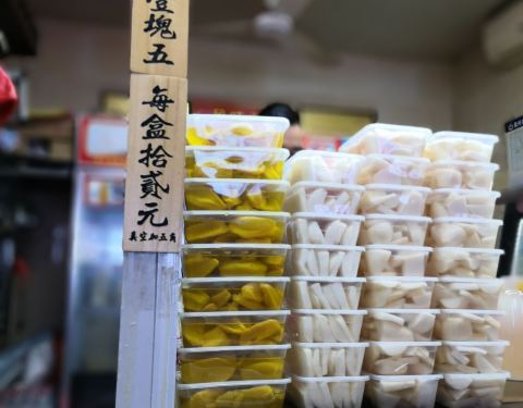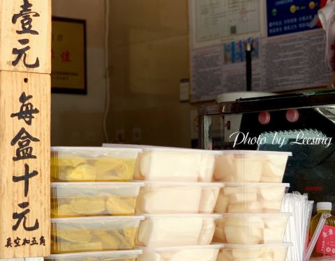 ∠( ᐛ 」∠)_ ~ 厦门人在泉州 菜头,亦是闽南语中的白萝卜,菜头酸也就是酸萝卜,对于我这酸萝卜爱好者,这是不可错过的小吃。 「菜头酸」,东来家的菜头酸,源自1960年的泉州老味道,萝卜厚切,厚度大约有0.5毫米,保留了萝卜皮,与厦门的酸萝卜差异蛮大的,厦门以薄为主,刨成片或丝,更多的是作为开胃菜,而泉州的菜头酸,则可作为零食,爽口脆甜,酸度温和,很好的把握了萝卜的清爽。 一盒10元,带汤汁,也可单买一片尝鲜,1片1元,还有菜头酸夹花生,下次有机会试试。 「杨桃」,腌制的杨桃,咸甜咸甜的,同行四人都比较偏爱它,尤其是我家阿5。