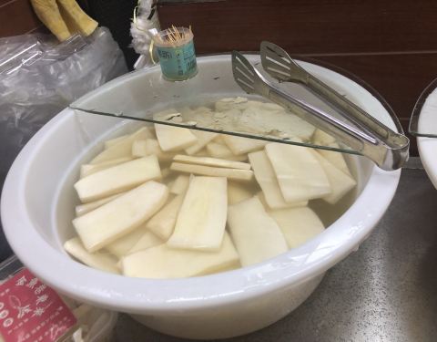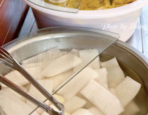 就是腌萝卜,在海丝金凤边上,1元买了1片,有点甜有点蒜的味道,不是很习惯。还看到有人买泡萝卜的汤喝。