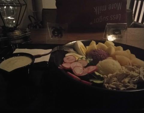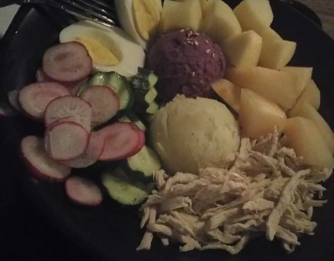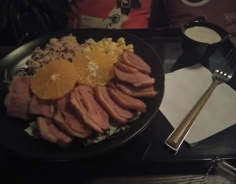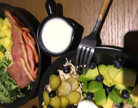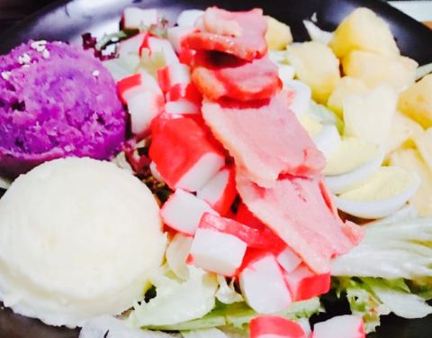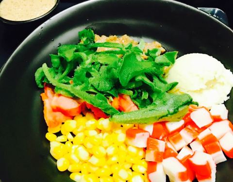晚上去吃的,原本想点鸡胸肉没有了,换成蟹柳了,这份忘记多少钱了,反正五个人,一人一盘还有一杯喝的以及两份鸡翅,三百块吧,喝的一杯要16左右,略贵了,吃着没有饱腹感,但是反正到现在都不饿,也许是饮料热量高吧,摆盘很好看,感觉摆盘比较贵,还有东西都是现成的,为何等了许久才上,不知道为啥,可能要摆盘花心思,吞拿鱼咸了一些,牛油果不够熟,其余可以,味道还不错吧,酱汁我觉得也偏咸,也许我口味偏淡,没有大桌子,几个人吃拼一下也还可以。紫薯泥不错,可口,虾也不错,菠萝好吃,蓝莓也喜爱。