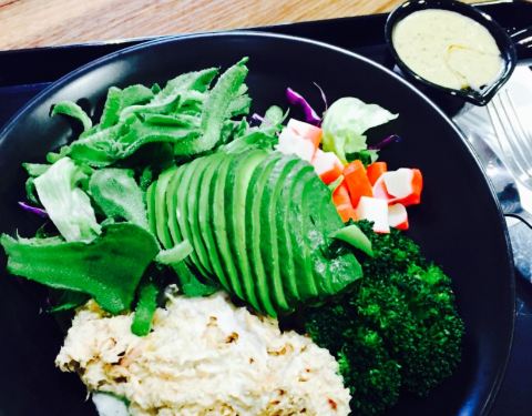 晚上去吃的,原本想点鸡胸肉没有了,换成蟹柳了,这份忘记多少钱了,反正五个人,一人一盘还有一杯喝的以及两份鸡翅,三百块吧,喝的一杯要16左右,略贵了,吃着没有饱腹感,但是反正到现在都不饿,也许是饮料热...晚上去吃的,原本想点鸡胸肉没有了,换成蟹柳了,这份忘记多少钱了,反正五个人,一人一盘还有一杯喝的以及两份鸡翅,三百块吧,喝的一杯要16左右,略贵了,吃着没有饱腹感,但是反正到现在都不饿,也许是饮料热量高吧,摆盘很好看,感觉摆盘比较贵,还有东西都是现成的,为何等了许久才上,不知道为啥,可能要摆盘花心思,吞拿鱼咸了一些,牛油果不够熟,其余可以,味道还不错吧,酱汁我觉得也偏咸,也许我口味偏淡,没有大桌子,几个人吃拼一下也还可以。紫薯泥不错,可口,虾也不错,菠萝好吃,蓝莓也喜爱。
