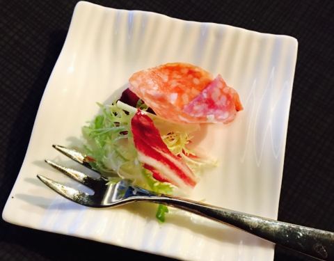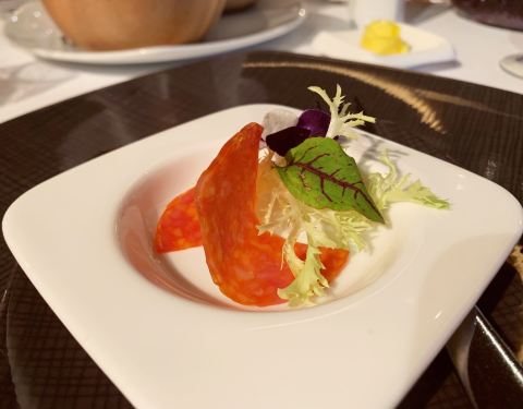 跟着是小巧的餐前小吃,包括餐中的柠檬雪葩全部都是送的,也让我有些没吃到主菜已经感觉饱了
