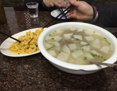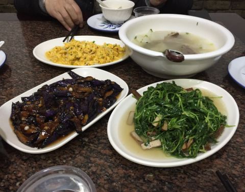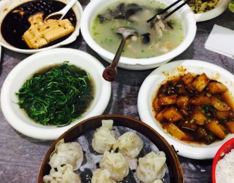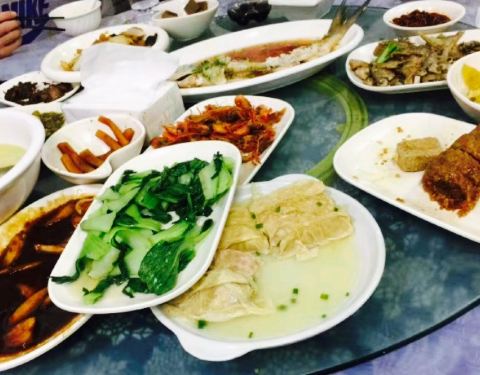 听镇上导游说是最大的菜馆了,拖着爹妈就进来了。位置其实挺不醒目的,可是倒是别有洞天。点了三菜一汤,招牌菜豆腐很爽口,还夹有一些小肉糜,酱油很鲜,另一招牌菜萝卜大肠非常赞,味道很浓郁又满足了我一颗爱吃大肠的心,清炒马兰头很香,第一次吃到蔬菜而不是马兰头干,挺新奇味道很好,不太满意的是咸肉菌菇汤,乏善可陈,早知道宁可点酸辣汤呢。整体是很满意的吃饭感受,每个人平均40,环境整洁。