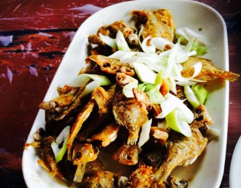 这家是很成熟的旅游饭店,去枫泾玩的大部分会在她们家吃。地方大,环境也不错,每张桌子都有隔断,不会太吵。点菜也毫不费事,一打开菜单就是得奖作品,特色菜之类,按人数都点上再加点就大同小异了。椒盐旁皮鱼很脆,也很香,当然很小啦,可是只有小才让人认为是野生的。我们怕上菜速度慢,之所以点了个冷菜的豆腐干,是因为吃饭的人好多,也不错,还有一个酱萝卜,蛮鲜美的,吃油腻了来一块,不错。点了一个田螺塞肉,一个炒米苋,还有茄子炒蛋,都还不错,量都很大,就是有点咸。没想到的是上菜速度很快,就是最后的菜饭慢了点,中间还说可能厨房太忙,会炒不出去。最后还是上了,巨大一盆,十块钱,真实惠啊,打包时居然用了二个打包盒。这点菜四个人吃,吃不完,结帐,才124块。合算啊。