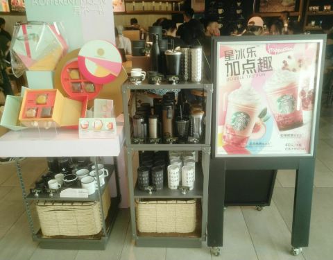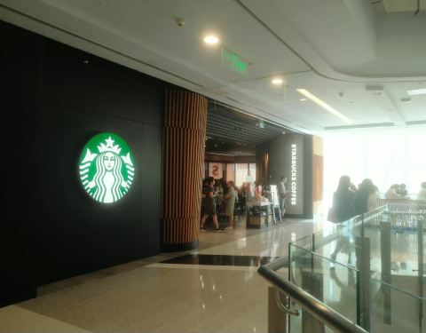这家星巴克咖啡馆位于上海来福士广场的二层,包括一个面积较大的店面以及一个面积不大的店外用餐区。 这家来福士广场星巴克咖啡馆的配置比较经典,店面里除了点餐台和餐桌,还有星巴克咖啡杯、咖啡豆以及其他相关商品的展示台。 星巴克咖啡馆的地面位置不错,距离步行电梯的距离不远,顾客络绎不绝。